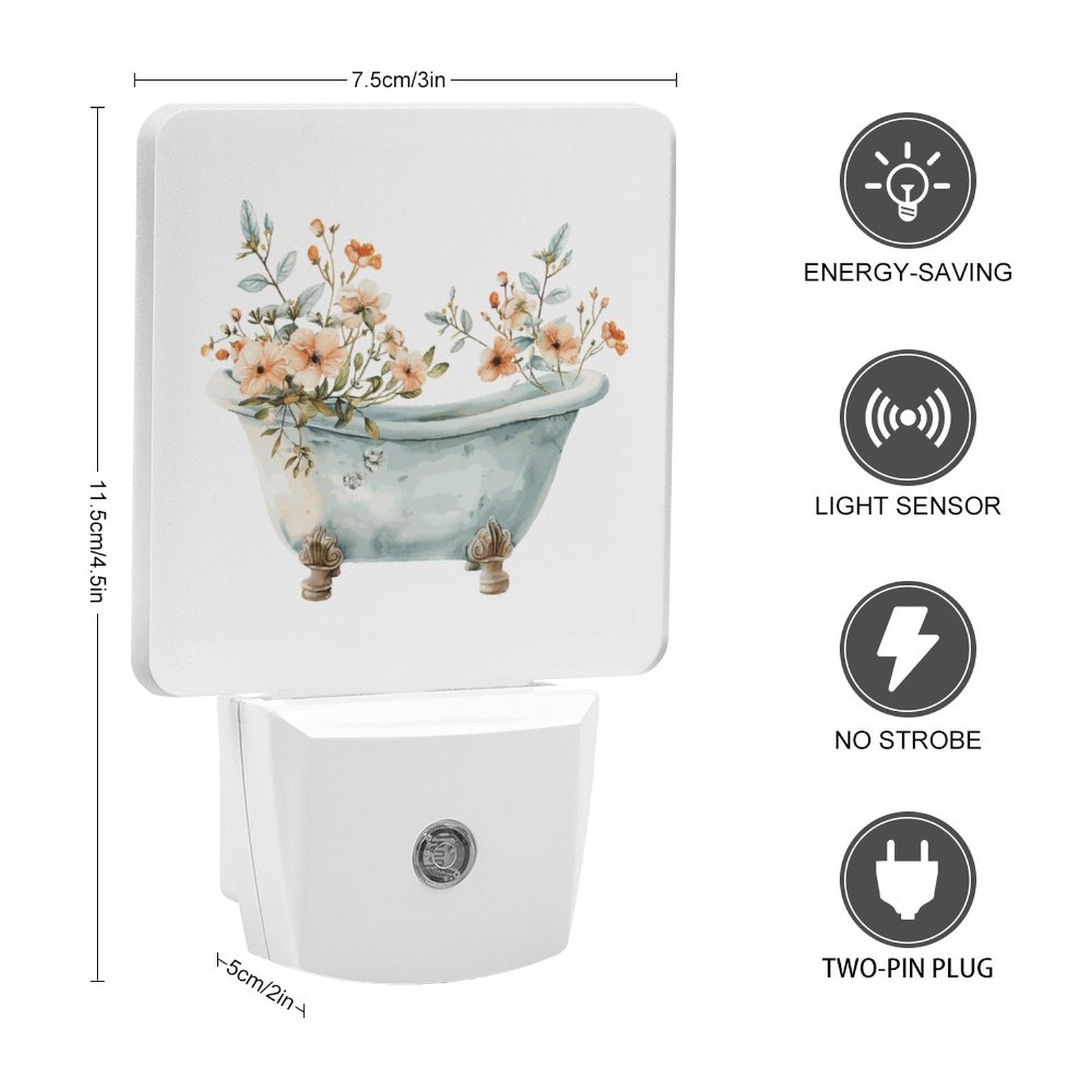 Size: Size varies slightly by shape. All night lights are approximately 4.5 inches across the design and 2 inches at the base.